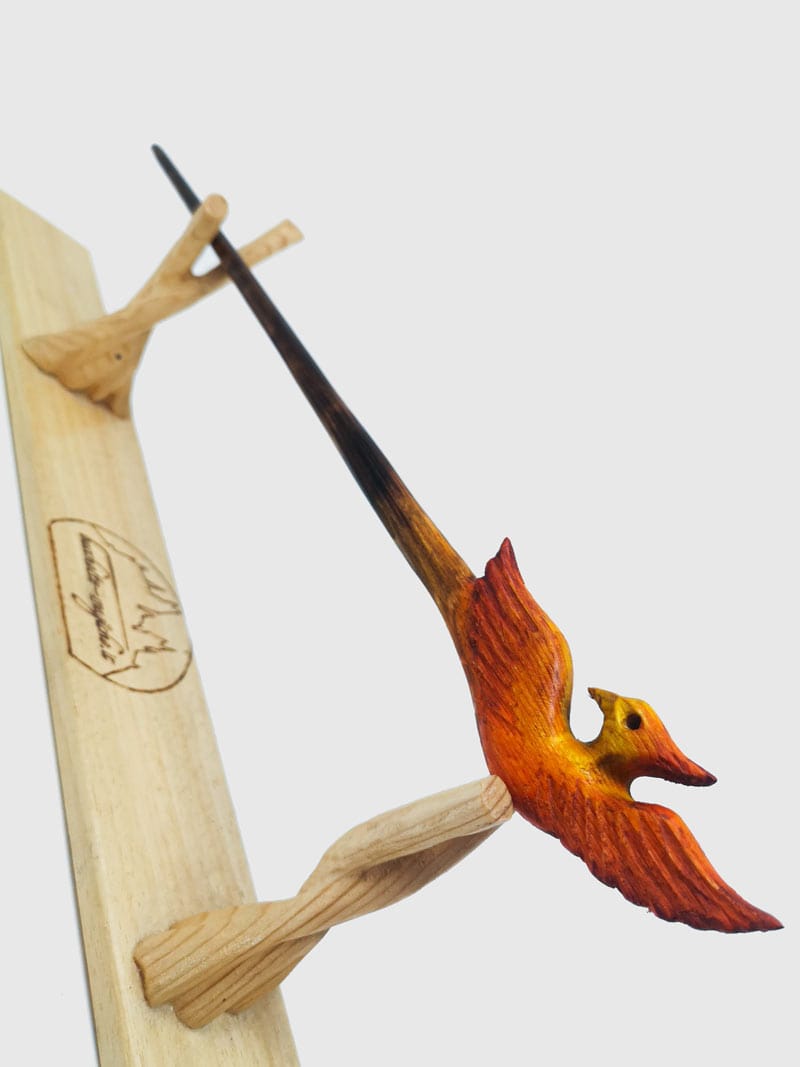 - Colorata usando solo mordenti naturali per legno. Noce scuro sfumato verso l’asta. Testa caratterizzata da tonalità del rosso, arancione e giallo. Lavorata con la tecnica della scurimento a fuoco.
